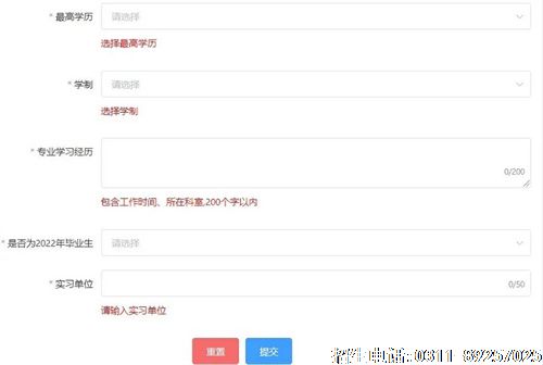 依次填写“最高学历”、“学制”、“专业学习经历”、“是否为2022年毕业生”、“实习单位”。