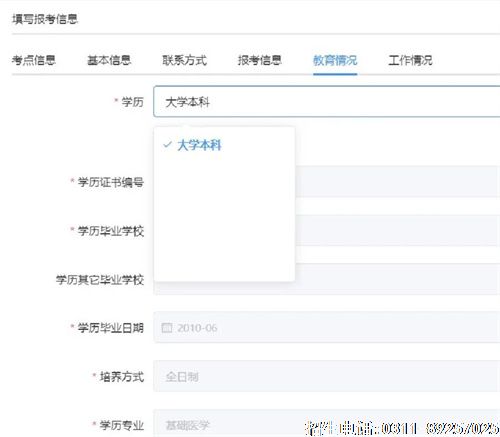 5.学历和学位相关信息下拉选择,引用基本信息中【学历学位信息维护】的内容。如需修改,请退出当前考试项目,在【学历学位信息维护】中进行新增,再次进入考试项目后,引用正确的学历和学位信息。