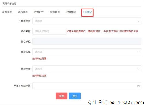 6.如实填写工作情况,“是否在岗”如选择“否”,则无需填写其它信息。 “单位名称”需要输入关键字(不可输入单位缩写、简称)检索后,在列表中选择相应单位,不可自行填写。