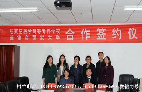 石家庄医学高等专科学校与菲律宾国家大学合作签约仪式 石家庄医学高等专科学校徐华平校长对国家大学来宾表示热烈欢迎,并介绍了学校的基本情况和口腔医学系的发展现状。徐校长指出,口腔医学是我校的一个主打专业,同时,我校非常重视国际交流合作,在口腔医学专业与国家大学展开合作,是我校发展建设中的一件大事,通过与国家大学的密切合作,我们的办学之路一定会越走越好。 会上,我校相关工作人员还对我校口腔医学专业学生出国留学情况,口腔医学专业教学计划、课程设置与实施情况等,向到访来宾进行了进一步详细介绍。 菲律宾国家大学国际处处长Glendora V.Tiu,Ph.D介绍了该校概况,口腔医学院院长Annalie N.Delemos,Ph.D.对该校口腔医学专业教育及专升本项目实施内容做了详细介绍,国家大学驻华办事处主任孟兵就该项目的优势、就业等情况进行了较全面的补充说明。双方就具体合作事宜进行了深入交流和协商,对今后深化双方合作达成了共识,徐华平校长和国家大学国际处处长Glendora V.Tiu,Ph.D正式签署了合作协议,与会人员亲切合影留念。 签约仪式结束后,在徐校长一行的陪同下,国家大学来访人员对我校校园建设、图书馆、生命科学馆等进行了参观。参观中,来访成员对我校专业特色品牌和硬件建设给予了高度评价,并在生命科学馆来宾留言簿上亲切赠言。 下午4时,国家大学来访人员、我校接待人员以及40余名学生代表来到第二教学楼2503教室,出席了口腔医学专业国际留学班开班典礼暨雅思英语开课仪式。 徐华平校长为典礼致辞。致辞中,徐校长对入选国际班的同学们表示衷心的祝贺,向国家大学各位来宾表示衷心的感谢。他指出,作为我校首个口腔专业国际班,本次国际班的开班在我校历史上是浓墨重彩的一笔,具有划时代的开创意义,并对同学们提出了三点希望:一是希望同学们把握机会,站在人生巅峰的视角看待国际班。国际班为各位同学提供了一次接受国际化教育的机会,国际教育背景和跨文化教育模式将对同学们的个人发展产生极为深远的影响,这就要求同学们提高站位、提升眼界,才能顺利完成学业;二是希望同学们以顽强拼搏的精神,学好专业课,突破语言关;三是希望同学们把做人放在首位,传播中华文化的使者,做中菲交流的使者,不辜负学校和家庭的殷切期望。 国家大学口腔医学院院长Annalie N.Delemos,Ph.D在典礼上进行了亲切致辞。学生代表陈春宇进行了双语发言。双方人员和国际班第一批15名学生合影留念。 典礼后,来访人员来到第二教学楼2221教室,就口腔医学专业留学事宜,与口腔医学系2017级3班的100余名同学进行了亲切交流。 据悉,菲律宾国家大学(National University),是菲律宾的优质大学之一,位于菲律宾首都马尼拉,成立于1900年8月1日,采用美国教育体制,是全菲律宾第一所使用英语教学的大学。自成立以来,已经产生了两任菲律宾总统,其毕业生在该国医学、政治、商业、艺术、体育、教育、建筑等多个领域拥有广泛的影响力。该校口腔医学专业有96年历史,口腔专业名列国家前茅,毕业生大多前往欧美就业,直接为美国培养口腔医师。国家大学与我校采用“2+4专升本”合作模式,我校口腔专业学生大二结束后,赴国家大学继续攻读4年,获得中国教育部承认、全世界认可的国家大学本科学历学位。 石家庄医学高等专科学校是国家教育部批准,河北省教育厅主管的全日制高校,面向全国招生,有中专部和大专部。成教部,培训部等。教学设施齐全,师资力量雄厚,校园占地1572亩,风景优美。我校是全国医学高校前十名,2018年面向全国招生,咨询电话:0311-89257025、13383115636 QQ:1428427717 相关阅读: