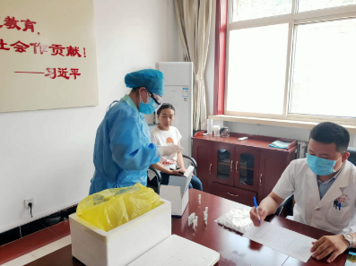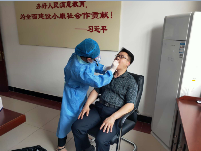 石家庄冀联医学院组织全体教职工进行核酸检测6月10日上午,我校邀请石家庄长城医院医师李健雄护士张阳到校为全体教职工进行新冠病毒核酸检测。 上午9:00,全体教职工在办公楼一楼会议室进行新冠病毒核酸检测。大家戴好口罩,登记个人信息及健康情况有序排队接受检测。医护人员身穿全套防护设备,用咽拭子擦拭教职工咽后壁及双侧咽扁桃体,采集分泌物后,浸入保存液中封存送检。整个流程操作规范、防护到位、安全严谨。