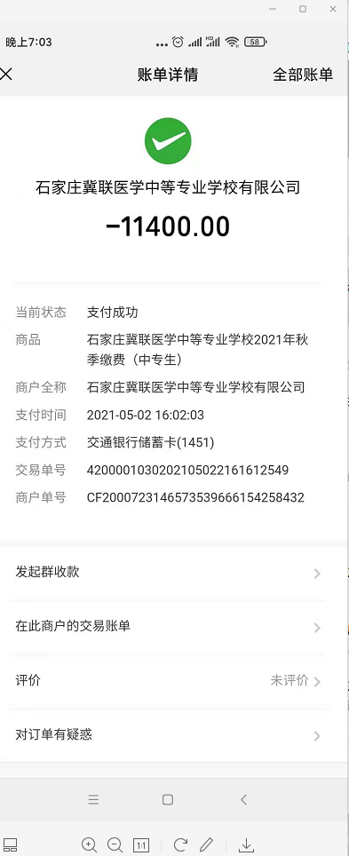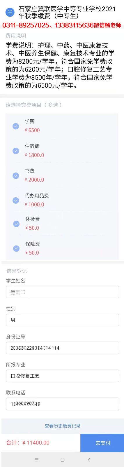 学生通过交费成功以后记得截图给杨老师或李老师,帮你安排后续的查询记录和安排通知书和收据。切记不要盲目自己交费,到时候财务查询不到可是您的损失。 石家庄冀联医学院咨询电话:0311-89257025、15383298687 、13383115636 石家庄冀联医学院微信号:13383115636 杨老师、15383298687李老师 石家庄冀联医学院咨询QQ:1428427717 了解更多专业详情可点击查看>>石家庄冀联医学院招生简章
