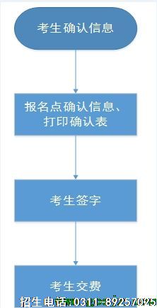 河北省2023年对口升学考生信息去人和考生交费于5.5日进行今年我省对口升学考生考试信息确认和考试费交纳工作将于5月5日9时至5月8日17时进行。 已通过2023年高考报名,且需参加6月7日—8日对口升学全省统一文化考试的考生均须参加。 考生须按照报名点的要求进行考试信息确认并交费。考试信息确认和交费流程如图: