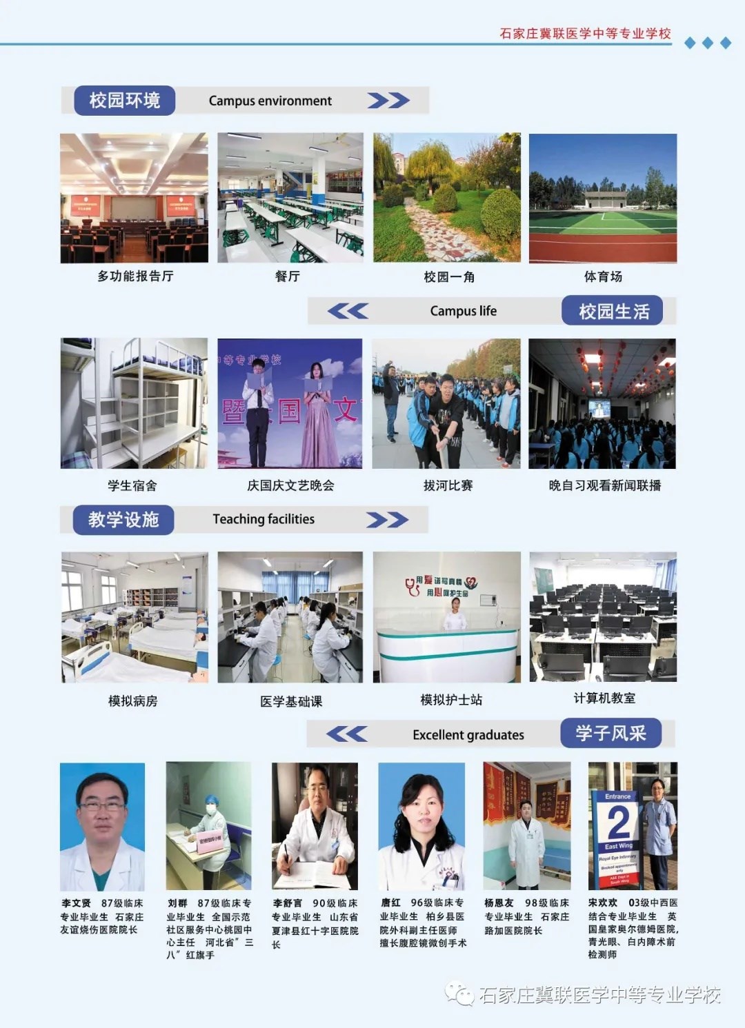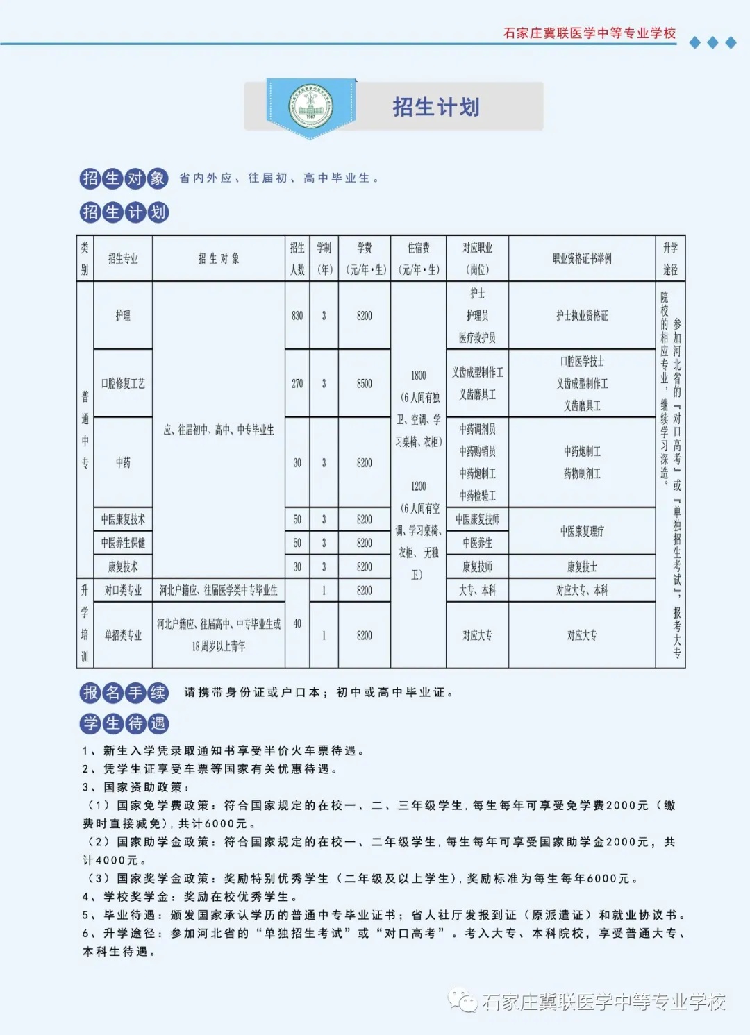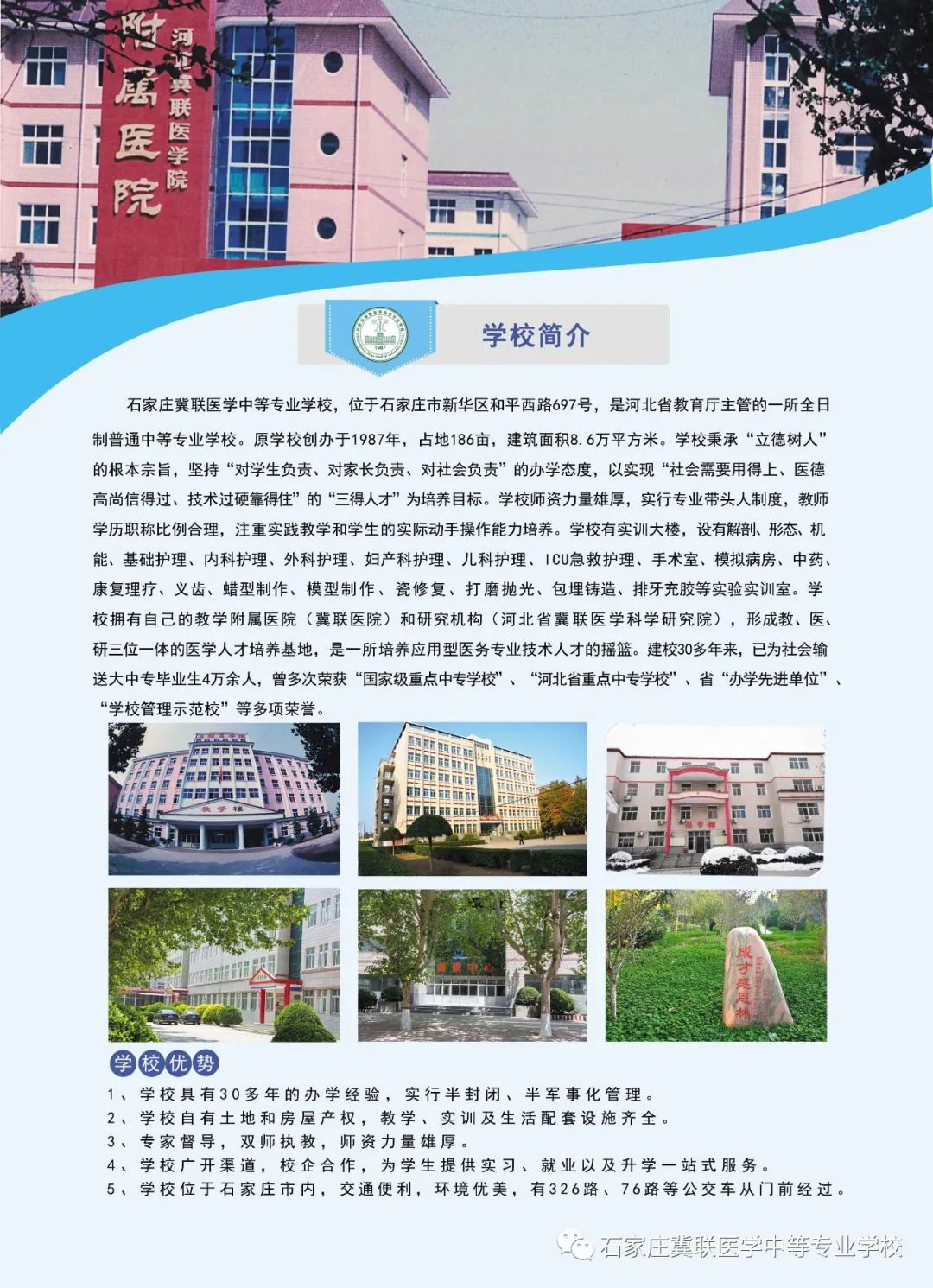 通过招生简章的介绍,相信你也对我们学校有所了解,经过多年的合合分分,石家庄冀联医学院也是老学校了。无论在哪一方面都是比较优秀的。如果孩子初中生建议在市里先上学。