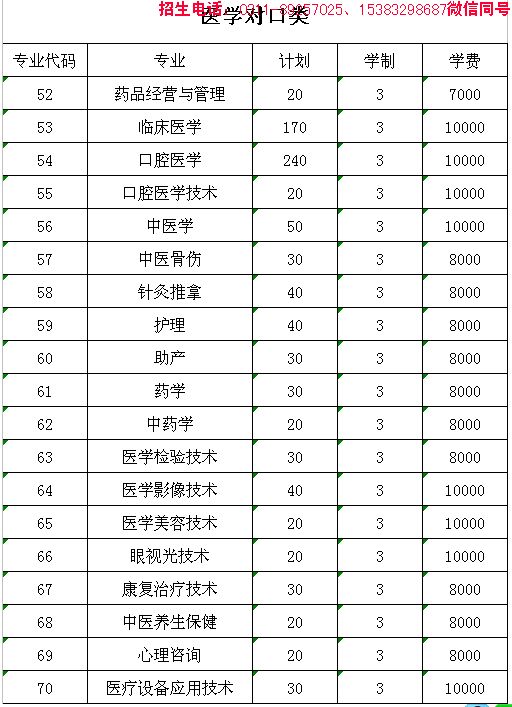 石家庄医学高等专科学校对口招生计划和费用详情: