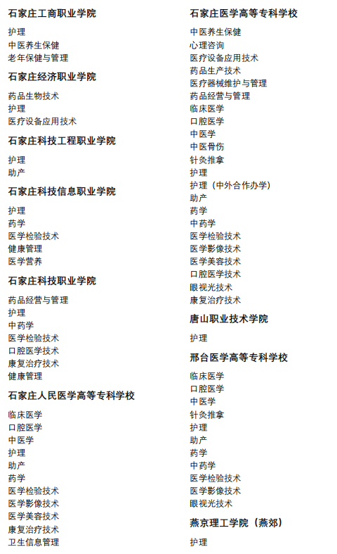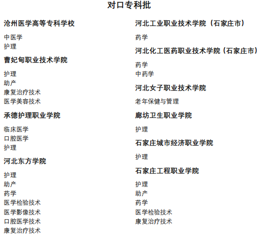这些院校最近几年都招生对口类考生,每年的专业都差不多,而且招生名额也较多。石家庄冀联医学院的学生对口升学时可根据自己的成绩选择以上适合自己的院校。