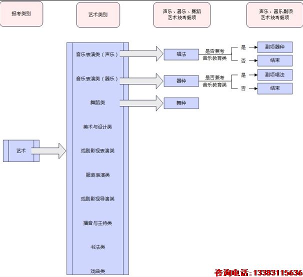 八、报名时如何选择考试类型及报考类别? 考试类型包括“统考”和“对口”。“统考”与“对口”两者不能兼报。 1.统考 参加普通高校招生全国统一考试及河北省普通高中学业水平选择性考试的考生、参加经教育部批准的高校单独招生以及其他需要通过普通高校招生录取或备案的考生均选择“统考”,如报考保送生、国家体育总局组织文化考试的体育单招、消防单招、残障单招或职教师资班等。 统考报考类别分为普通、艺术、体育。 (1)普通 拟报考非艺术、体育专业的考生报考类别应选普通。报考普通类的考生不能兼报艺术、体育类。 (2)艺术 拟报考艺术专业的考生报考类别应选艺术。未按艺术参加高考报名的考生,不能参加本年度艺术类专业考试,同时不能录取至使用艺术专业考试成绩的相关艺术类专业。 (3)体育 拟报考体育专业的考生报考类别应选体育。未按体育参加高考报名的考生,不能参加本年度我省普通体育类专业测试及录取。体育专业考试实行全省普通体育类专业统一测试。 艺术及体育招生的有关要求详见艺术类和体育类专业招生有关文件规定。 2.对口 参加中等职业学校对口升学全省统一考试的中等职业学校及技工学校毕业的考生应选择“对口”。 对口报考专业类分为旅游类、财经类、农林类、畜牧兽医类、机械类、电子电工类、建筑类、计算机类、医学类、学前教育类。考生只能选择与高级中等教育阶段所学专业相对应的对口专业类。报考机械类、农林类的考生还须选择测试项目。 九、报考艺术类考生如何选择“艺术类别”? 按照教育部统一部署,2024年起我省普通高校招生艺术类专业考试分为美术与设计类、音乐类(分音乐表演、音乐教育两类,其中音乐表演类考试包括器乐、声乐两个方向)、舞蹈类、表(导)演类(分戏剧影视表演、服装表演、戏剧影视导演三个方向)、播音与主持类、书法类、戏曲类等7个科类。其中,美术与设计类、音乐类、舞蹈类、表(导)演类、播音与主持类、书法类等6个科类实行省级统考;戏曲类按教育部要求执行,实行省际联考。拟参加艺术类专业校考的考生,均须参加相应的省级艺术类统考且合格。具体高校艺术类招生专业与省级统考科类对应关系,考生可查阅高校发布的章程或咨询院校。 根据我省实际,高考报名时“报考类别”选择“艺术”的考生须从音乐表演类(声乐)、音乐表演类(器乐)、舞蹈类、美术与设计类、戏剧影视表演类、服装表演类、戏剧影视导演类、播音与主持类、书法类、戏曲类等10个“艺术类别”中选择1类报考,不可兼报。报考音乐表演类(声乐)的考生,可选择“兼考音乐教育类(声乐主项)”,同时获得音乐教育类(声乐主项)报考资格;报考音乐表演类(器乐)的考生,可选择“兼考音乐教育类(器乐主项)”,同时获得音乐教育类(器乐主项)报考资格。 报考音乐表演类(声乐)、音乐表演类(器乐)、舞蹈类的考生须在“声乐、器乐、舞蹈艺术统考细项”中分别对应填报一项唱法、器种、舞种。兼考音乐教育类的考生,还须分别对应填报一项“声乐、器乐副项艺术统考细项”,主项选择声乐的考生,副项须选择器乐;主项选择器乐的考生,副项须选择声乐。器种为“中西打击乐”专业考生,还须具体填报两种不同打击乐器,其中至少一种为音高类打击乐器。 具体报考流程见以下图例。