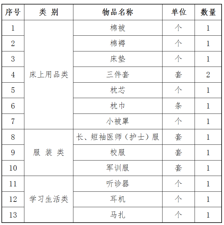 (二)乘车路线: 1、火车站西广场乘9路到新百广场站转乘17路车至小安舍站下车,高架桥下十字路口向北前行300米路西即到。 2、火车北站乘40路到小安舍站下车,高架桥下十字路口向北前行300米路西。 三、报到所需携带的证件及材料: (一)新生报到需携带录取通知书(凭录取通知书可享受半价火车票)、本人身份证或户口本、初中或高中毕业证原件及复印件。 (二)新生如系共产党员、共青团员,请按有关规定办理党、团组织关系转接手续,入学时交学校党、团组织部门。 四、国家助学金、免学费资助标准及所需提供的材料: (一)国家助学金:根据河北省教育厅冀教财函[2015]45号通知规定,一、二年级全日制中专在校学生可按国家规定的条件和比例享受国家助学金资助2000元/年/生。 申请者所需提供的材料:家庭户口本首页及本人页的原件、复印件、家庭经济困难证明材料原件(低保证原件;无低保证的乡镇户籍学生须由村、乡(镇)及县民政部门出具家庭经济困难证明材料原件,城市户籍学生须由居委会、街道办事处、区民政部门出具的家庭经济困难证明材料原件)。满16周岁及以上的学生除携带户口本外,还需携带二代身份证原件和复印件。 (二)国家免学费:根据河北省教育厅冀教财函[2015]45号通知规定,一、二、三年级全日制中专在校学生可按国家规定享受免学费资助2300元/年/生。凡符合条件者,入学报到交费时可在全年学费基础上直接减免2300年。 入学报到时学生必须提供户口本首页和本人页的原件、复印件进行现场审核,否则将不予以直接减免。 户籍为农村、乡镇、县镇非农、县城(含县级市)者,入学报到时可以直接减免2300元;城市户籍学生入学报到交费时必须缴纳全费,学校公开评比、公示无异议后,被认定为家庭经济困难的学生,由学校负责返还2300元。 申请者所需提供的材料:城市以下户籍学生只需提供家庭户口本首页及本人页的原件、复印件;城市户籍学生在参评时除提供家庭户口本首页及本人页的原件、复印件外,还需提供家庭经济困难证明材料原件(低保证原件或由居委会、街道办事处、区民政部门出具的证明材料原件)。 五、招生对象、学费等相关费用: (一)招生对象:应、往届初、高中毕业生。 (二)学费等相关费用: 1、学费:护理6500元/年/生,口腔修复工艺6600元/年/生。 2、住宿费:600元 /年/生。 3、书费:一次性预收800元(学生离校前多退少补)。 4、其它代购用品费:护理专业850元,口腔修复工艺专业820元,详见《2019年春季新生代购用品清单》。 备注:根据河北省教育厅与河北省质量技术监督局文件精神,学校公寓实行统一管理,为保障学生身体健康和公寓卫生安全,学生不得将劣质床上用品带入校园,到校后统一选购由省纤维检验局检验合格的床上用品、校服、学习用品等。 2019年春季新生代购用品清单